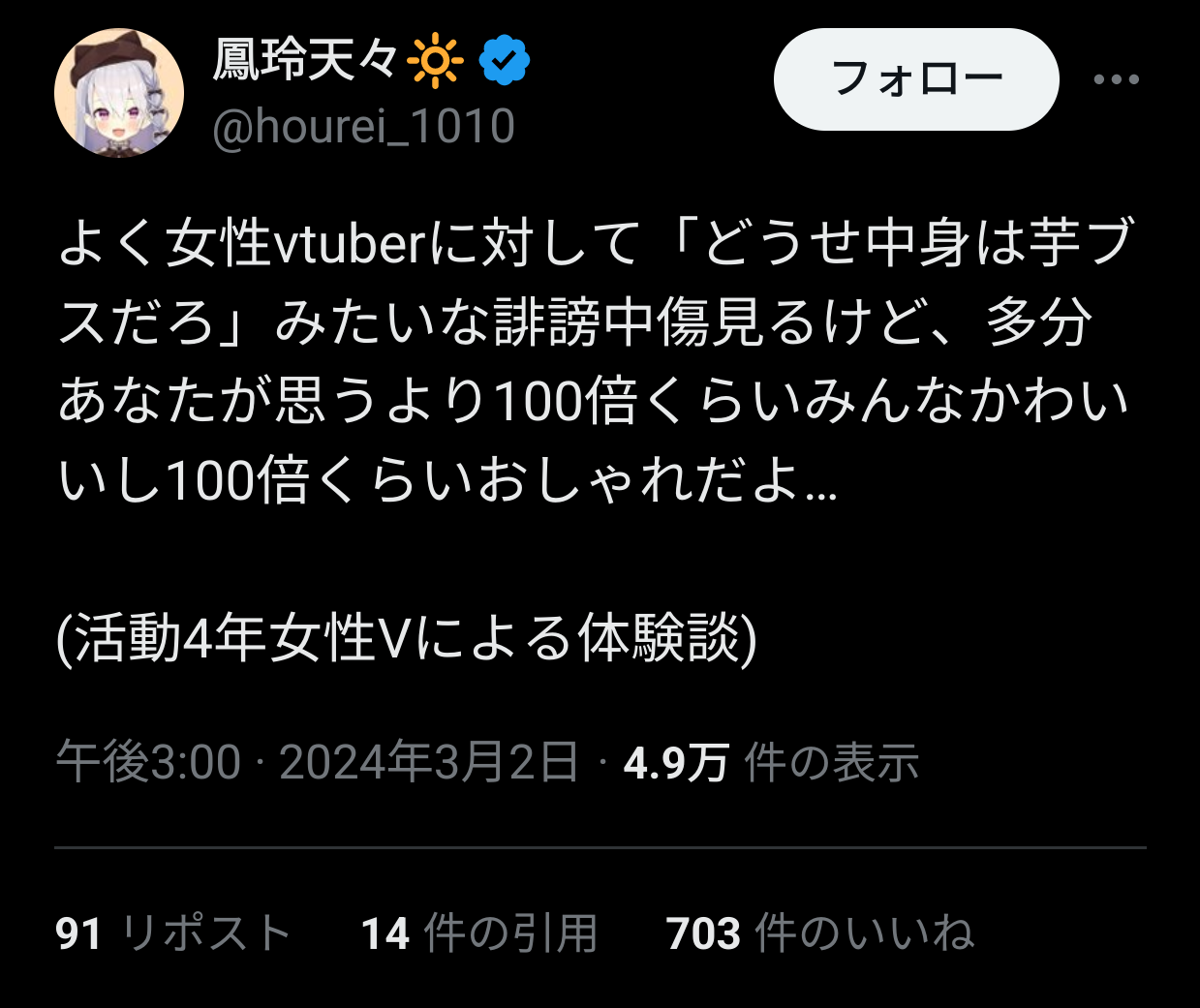 よく女性vtuberに対して「どうせ中身は芋ブスだろ」みたいな誹謗中傷見るけど、多分あなたが思うより100倍くらいみんなかわいいし100倍くらいおしゃれだよ…
