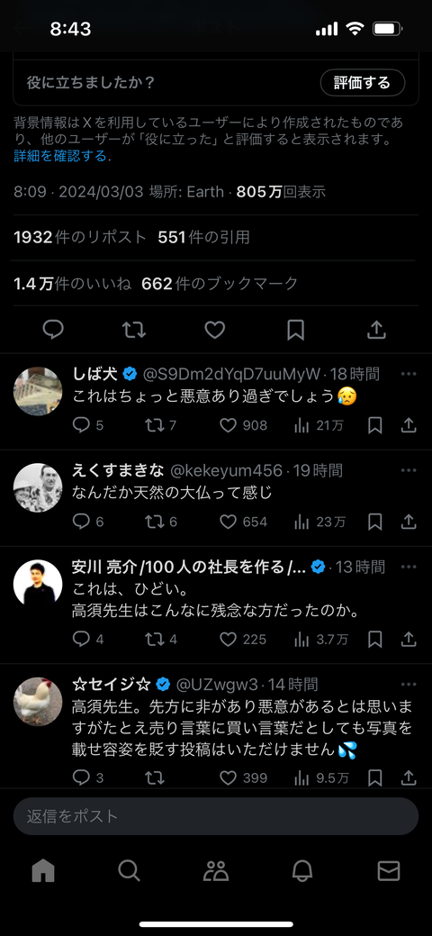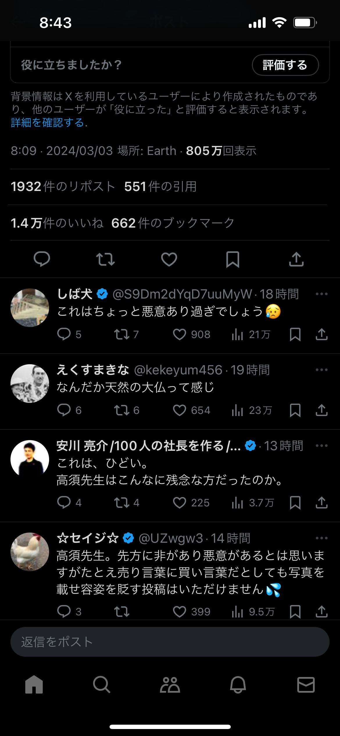 【悲報】高須先生、例のツイートでリプライ欄の信者にも叩かれる。今回ばかりはネトウヨもドン引き Twitter Facebook はてブ LINE コピー 2024.03.04 スポンサーリンク 1:それでも動く名無し:2024/03/04(月) 10:00:45.96 ID:EPnHSbBnd ↓ https://x.com/katsuyatakasu/status/1764065407177241042?s=46 続きを読む