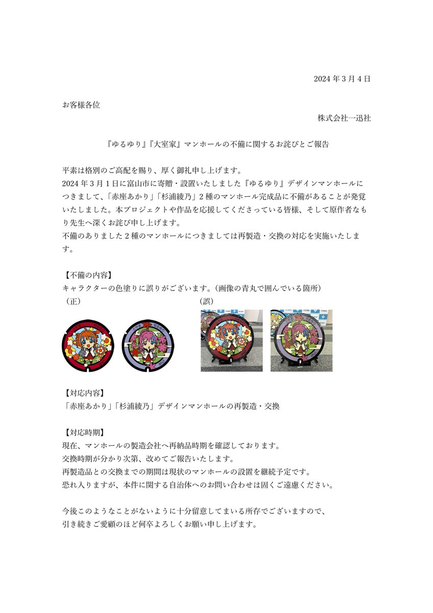 富山市に寄贈いたしました『ゆるゆり』デザインマンホールにつきまして、2種のマンホール完成品に不備があることが発覚いたしました。
