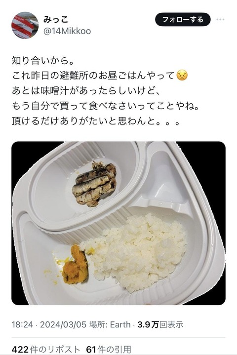 【能登】震災から3ヶ月、避難所飯こうなる (※画像あり) Twitter Facebook はてブ LINE コピー 2024.03.06 スポンサーリンク 1:それでも動く名無し:2024/03/05(火) 21:25:24.46 ID:bLIBUenz0 7:それでも動く名無し:2024/03/05(火) 21:26:56.37 ID:8EyDAnI20 かぼちゃの煮物くらいもっと大きいの出せないのだろうか 8:それでも動く名無し:2024/03/05(火) 21:27:22.72 ID:UHIfUFzA0 こういうスレで知り合いが取り上げられるの初めて見た 続きを読む