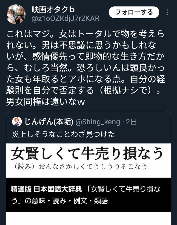 これはマジ。女はトータルで物を考えられない。男は不思議に思うかもしれないが、感情優先って即物的な生き方だから、むしろ当然。恐ろしいんは頭良かった女も年取るとアホになる点。自分の経験則を自分で否定する(根拠ナシで)。男女同権は遠いなw https://t.co/SABPrW4cJR