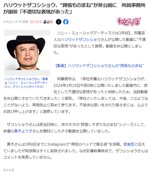 【悲報】ハリウッドザコシの所属事務所が謝罪 Twitter Facebook はてブ LINE コピー 2024.03.09 スポンサーリンク 1:それでも動く名無し:2024/03/09(土) 18:47:02.81 ID:WmtY7eoE0.net 2:それでも動く名無し:2024/03/09(土) 18:48:22.48 ID:cCuWSK8N0.net なんで攻撃的な奴ほど打たれ弱いというか被害者ぶるのんや? 3:それでも動く名無し:2024/03/09(土) 18:49:09.07 ID:1BoggGhK0.net あかんやん 続きを読む