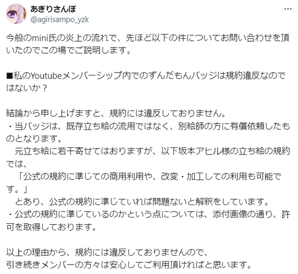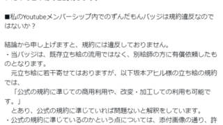 ■私のYoutubeメンバーシップ内でのずんだもんバッジは規約違反なのではないか?