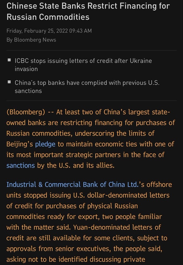 *CHINESE STATE BANKS RESTRICT FINANCING FOR RUSSIAN COMMODITIES