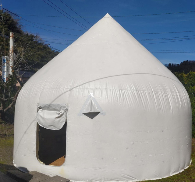 屋外用のハウスは円すい形で、テント生地を送風機で膨らませ、内側にスプレーでウレタンの断熱材を吹き付ければ完成。断熱材が固まると壁の役割を果たし、柱がなくても形状を保てる。高さ約4メートル、広さ約20平方メートルで、保温性も高い。約1時間で設置可能