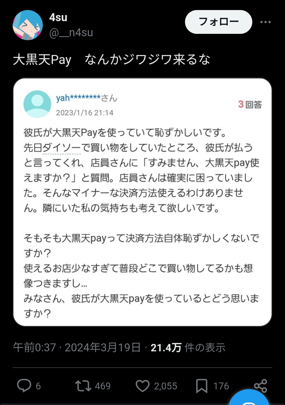 【悲報】女さん、彼氏が大黒天payを使ってただけで幻滅してしまう Twitter Facebook はてブ LINE コピー 2024.03.20 スポンサーリンク ◇ 1: 名無しさん 2024/03/19(火) 16:47:37.347 ID:8dOHmO2hP いかんでしょhttps://twitter.com/__n4su/status/1769749855474258147 ◇ 3: 名無しさん 2024/03/19(火) 16:48:02.921 ID:8dOHmO2hP 決済方法すら自由に選ばせてもらえわないのか… ◇ 8: 名無しさん 2024/03/19(火) 16:48:52.246 ID:415kBQKXR 大黒天payってラ・ムー限定ちゃうんか草 続きを読む
