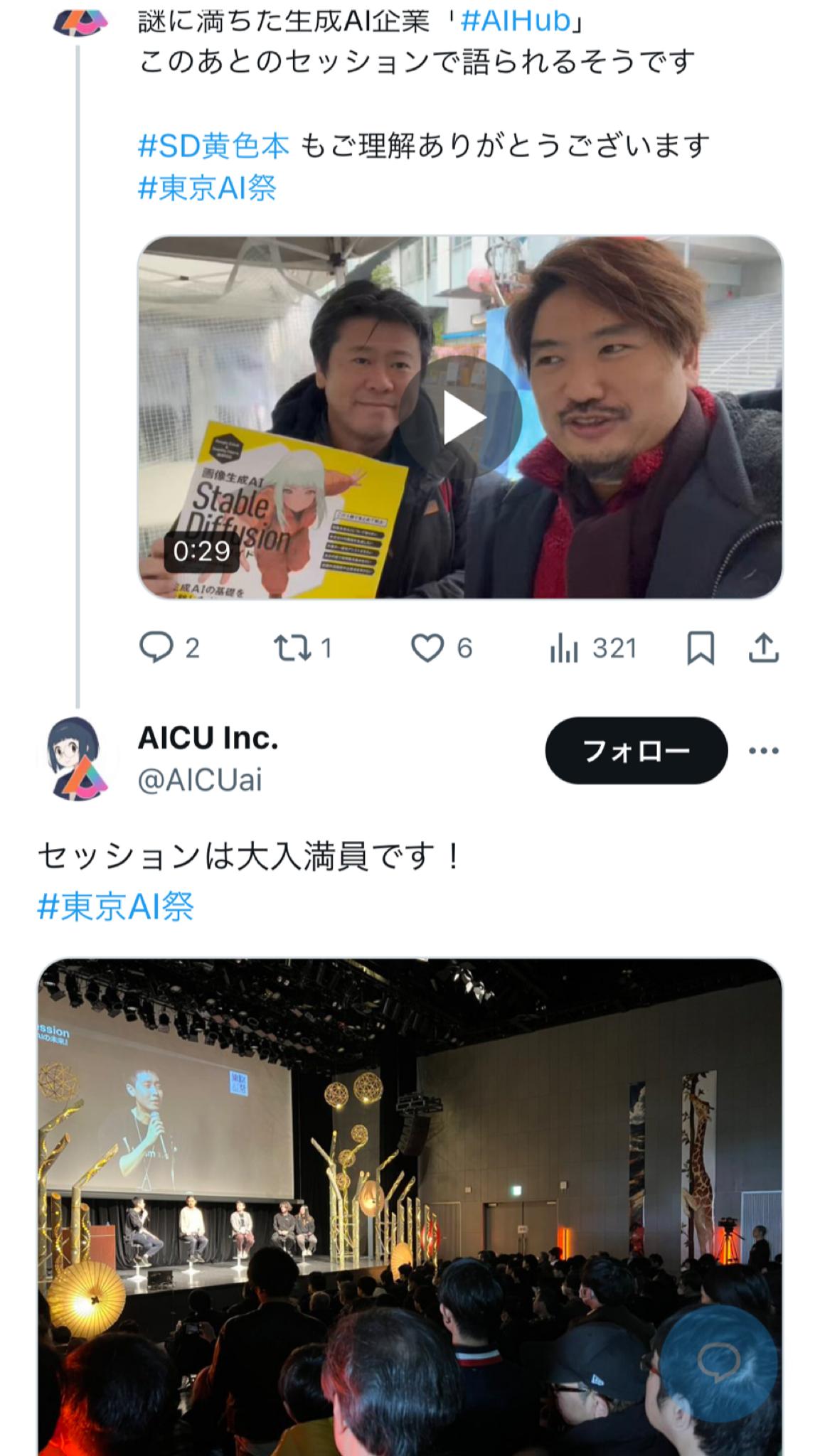 【画像】AIイラストの展示会、満員御礼の大盛況wwwwwwwwww Twitter Facebook はてブ LINE コピー 2024.03.23 スポンサーリンク 1:それでも動く名無し:2024/03/23(土) 15:15:27.25 ID:GbauEGhb0.net #東京AI祭 ついに本日開催です! 3/23. 24と2日間、 みなさんに会えるのを楽しみにしています https://x.com/tokyoaisai/status/1771370878863085677?s=20 12時の開場前から行列 AI開発者の特別インタビューは満席で入れない程の大盛り上がりの模様 続きを読む
