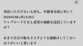 「対応いただけないも何も、申請者全員に対して 2024/03/06(水)8:56に アップロードURLの変更の連絡をしていますが?