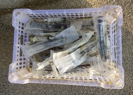 注射器が大量漂着、鳥取でも 袋にロシア語の表記か