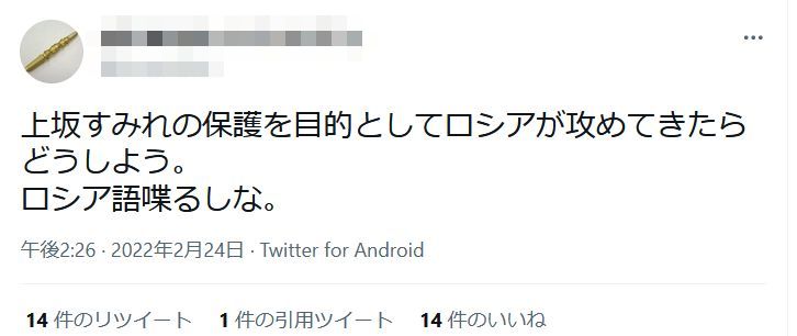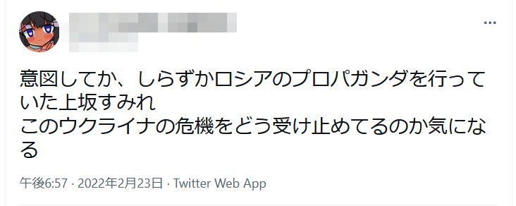 人気声優の上坂すみれさん、ロシアが好きというだけでTwitterで苦言を呈されてしまう… Twitter Facebook はてブ LINE コピー 2022.02.27 スポンサーリンク 1:風吹けば名無し:2022/02/26(土) 23:59:10.06 ID:2LDdG1IlM.net 3:風吹けば名無し:2022/02/26(土) 23:59:24.62 ID:2LDdG1IlM.net ええんかよ 4:風吹けば名無し:2022/02/26(土) 23:59:30.95 ID:2LDdG1IlM.net こんなこと 5:風吹けば名無し:2022/02/26(土) 23:59:38.76 ID:NCQe5CFvM.net しゃあない 6:風吹けば名無し:2022/02/26(土) 23:59:47.09 ID:NCQe5CFvM.net それもまた人生 続きを読む