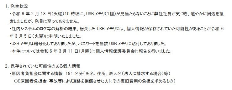 西日本高速道路(NEXCO西日本)は3月15日、個人情報191人分を保存していた可能性があるUSBメモリを紛失したと発表した。データは暗号化していたものの、メモリ本体にパスワードを貼り付けていたという。