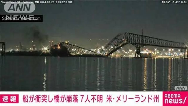アメリカ東部のメリーランド州で長さ2.5キロほどの橋に船が衝突し、橋が一瞬で崩れ落ちました。7人の行方が分かっていないということです。