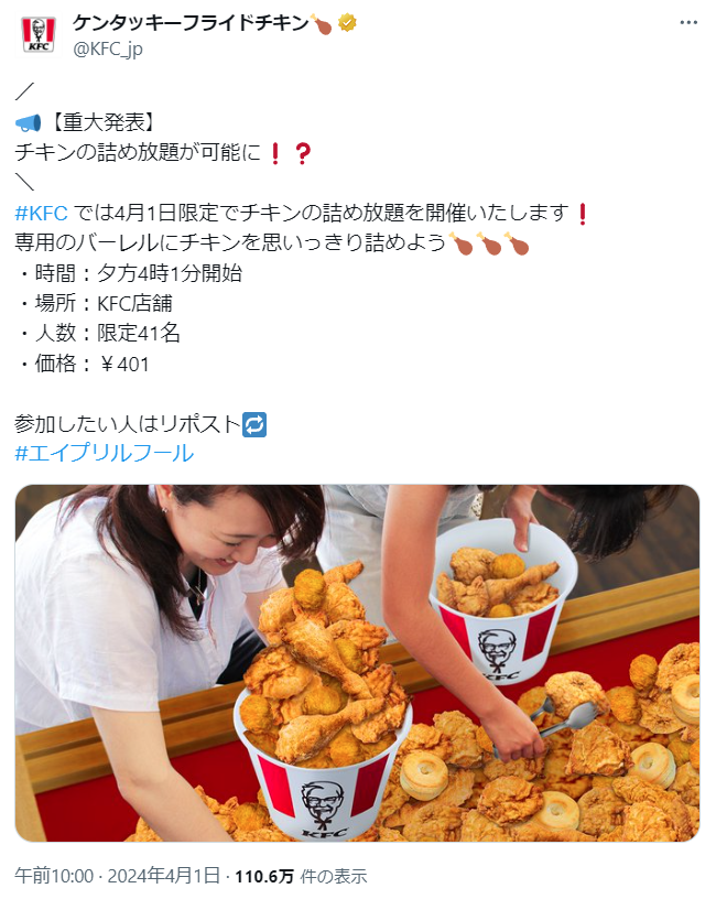 — ケンタッキーフライドチキン🍗 (@KFC_jp) April 1, 2024