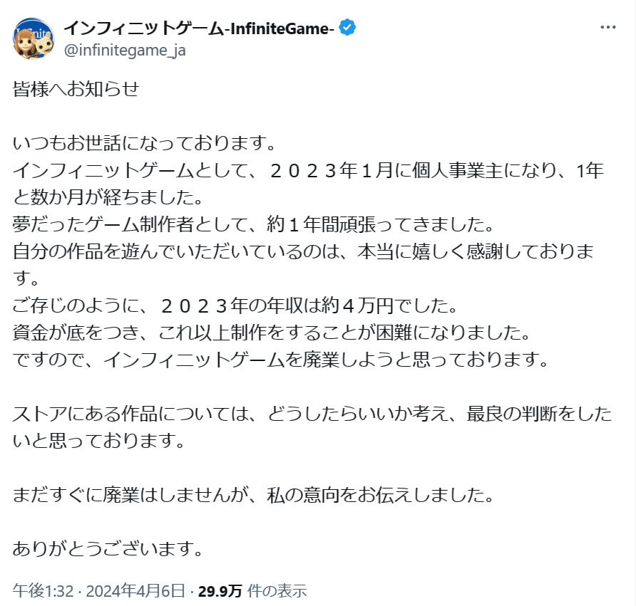インフィニットゲームとして、2023年1月に個人事業主になり、1年と数か月が経ちました。