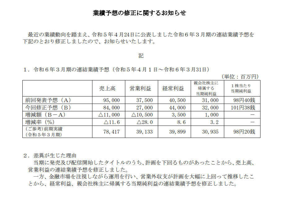 今期に発売および配信開始したタイトルのうち、計画を下回るものがあったことから、売上高と営業利益は予想を下回る見込みとなった。