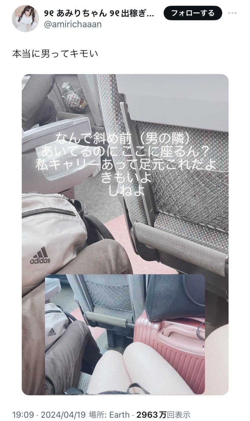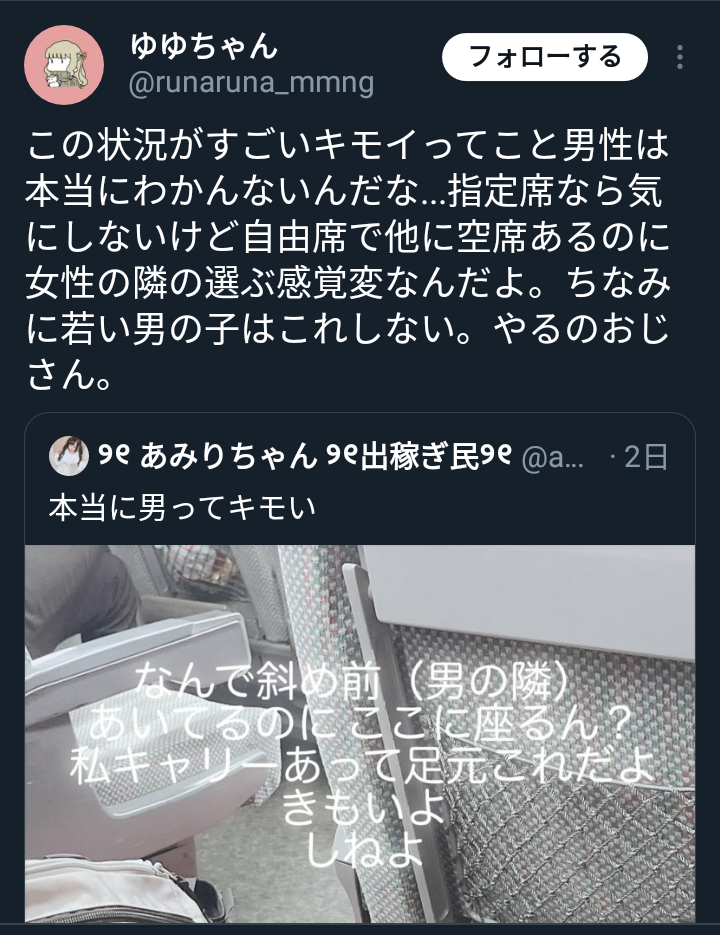 俺ならこう言う馬鹿女に難癖つけられたくねえから男の隣座るわ