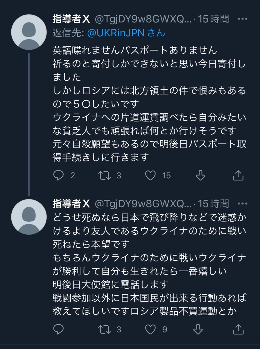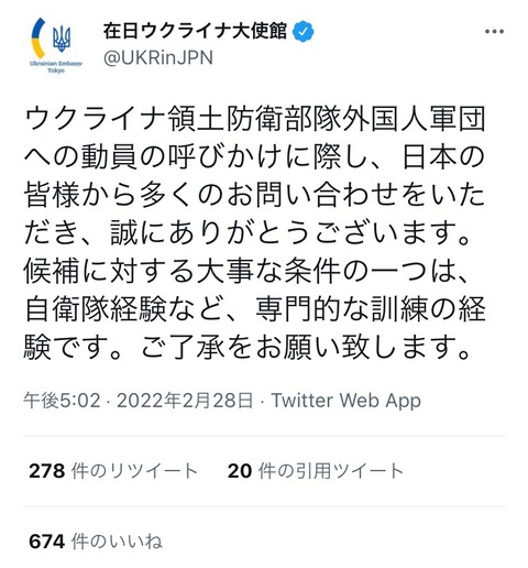 【画像】在日ウクライナ大使館「陰が戦力になるわけないだろバカが」 Twitter Facebook はてブ LINE コピー 2022.03.01 スポンサーリンク 1:以下、?ちゃんねるからVIPがお送りします:2022/02/28(月) 17:32:28.470 ID:OIcbEyewd.net 2:以下、?ちゃんねるからVIPがお送りします:2022/02/28(月) 17:33:24.503 ID:3IHWQZzZ0.net きしょすぎてワロタ 3:以下、?ちゃんねるからVIPがお送りします:2022/02/28(月) 17:33:30.889 ID:Oelb5JFs0.net CQCはワロタ 続きを読む