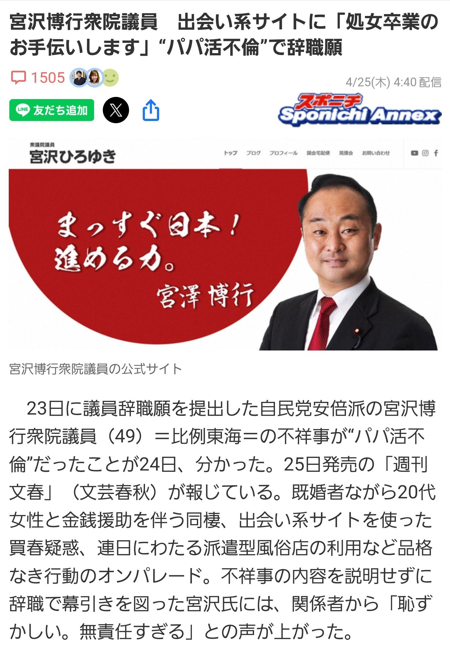 宮沢博行衆院議員 出会い系サイトに「処女卒業のお手伝いします」“パパ活不倫”で辞職願