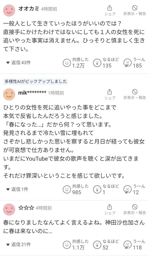 前山さんは21年12月22日、神田さんの訃報の際、追悼するとともに神田さんと真剣に交際していたことを公表。翌22年6月30日をもって、所属していたワタナベエンターテインメントを退所している。