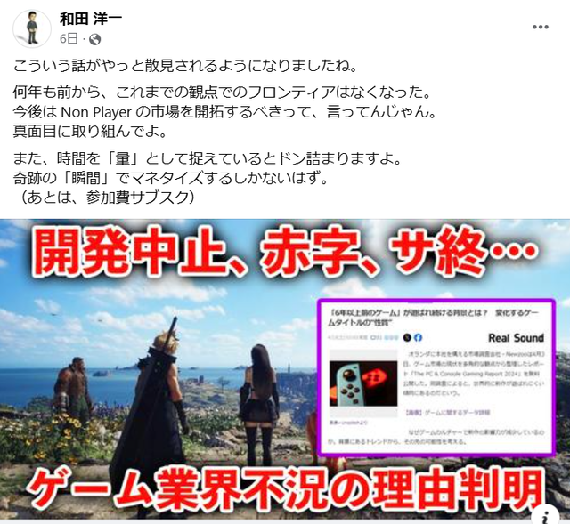 元スクエニ社長・和田洋一「スクエニの衰退はプロデューサー制を強引にティビジョン制にしたのと売上至上主義体質のせい」 Twitter Facebook はてブ LINE コピー 2024.05.06 スポンサーリンク ◇ 1: 名無しさん 2024/05/05(日) 15:00:02.18 ID:Q+8EgiR300505 https://www.facebook.com/yoichiwada528 ◇ 11: 名無しさん 2024/05/05(日) 15:06:04.34 ID:i9kKbKKx00505 ディビジョン制だから馬鹿みたいに金かかってんのか ◇ 12: 名無しさん 2024/05/05(日) 15:06:47.85 ID:Lt5Z2q5G00505 元社長が愚痴るぐらい腐ってるんだな 続きを読む