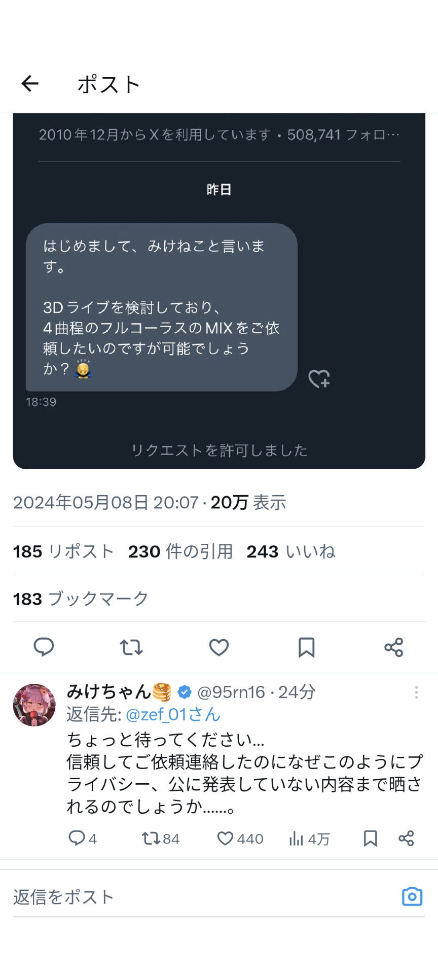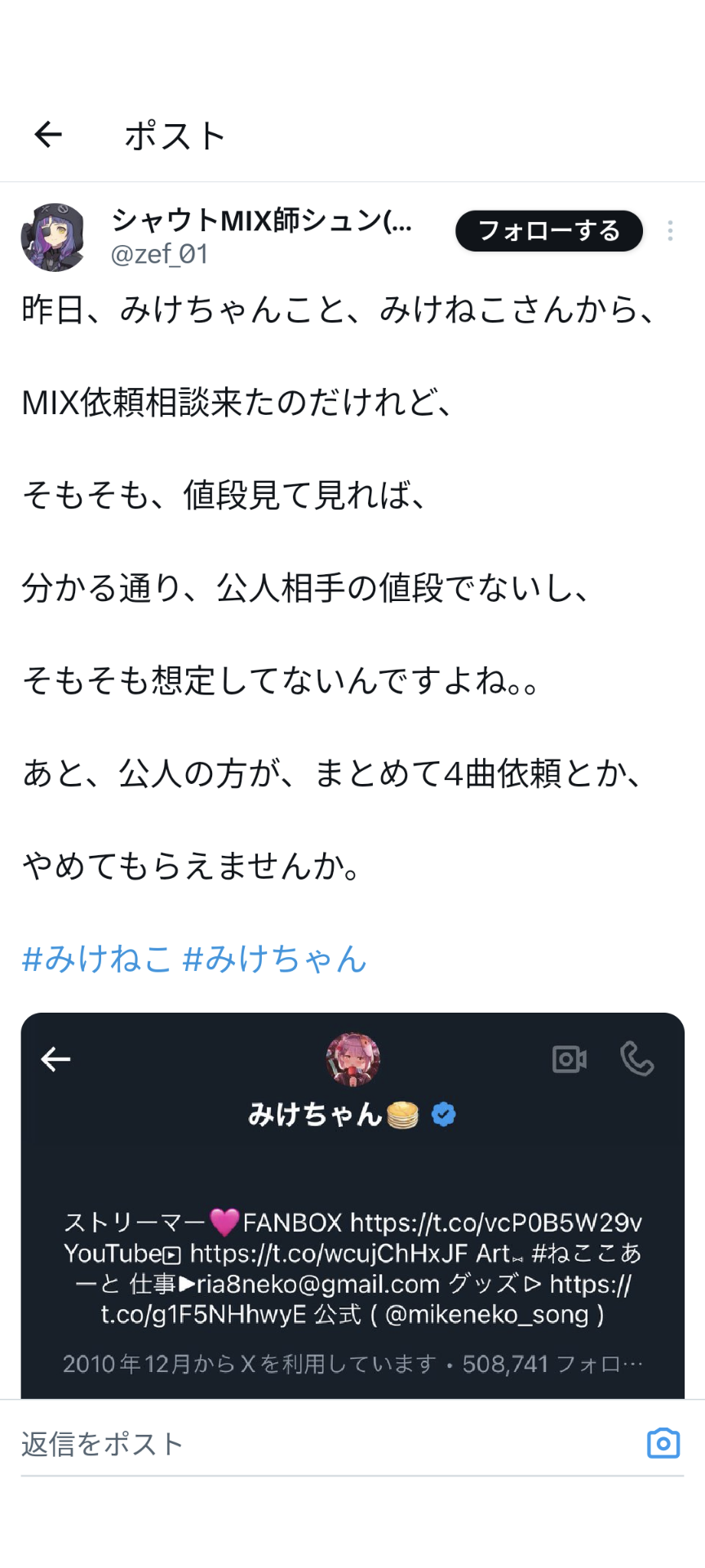 【悲報】みけねこさん、普通に曲のmix依頼をしただけなのに晒されてしまう Twitter Facebook はてブ LINE コピー 2024.05.09 スポンサーリンク ◇ 1: 名無しさん 2024/05/08(水) 21:32:50.439 ID:3Xav6YYLE ひどい😭 ◇ 3: 名無しさん 2024/05/08(水) 21:33:46.204 ID:NVLykxp1m 可哀想 ◇ 5: 名無しさん 2024/05/08(水) 21:33:54.797 ID:qRNXJJUnO みけねこっていうほど公人か? 続きを読む
