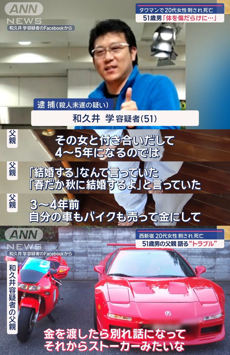 タワマン娘襲撃おじさん、女に結婚を仄めかされて車やバイクを売って金を渡したら別れ話を切り出されていた Twitter Facebook はてブ LINE コピー 2024.05.09 スポンサーリンク ◇ 1: 名無しさん 2024/05/08(水) 23:28:01.603 ID:YpkX/9RzQ 女と結婚するための結婚資金のために愛車を売る↓女に金を渡したら別れ話に↓愛車のNSXが軽バンになったよ😭↓金返せと女に迫ったらストーカー扱いで通報される↓刺殺事件へ ◇ 5: 名無しさん 2024/05/08(水) 23:28:57.252 ID:YpkX/9RzQ あんまりだよ ◇ 12: 名無しさん 2024/05/08(水) 23:34:43.536 ID:Gfz2H53F9 結婚詐欺やね 続きを読む