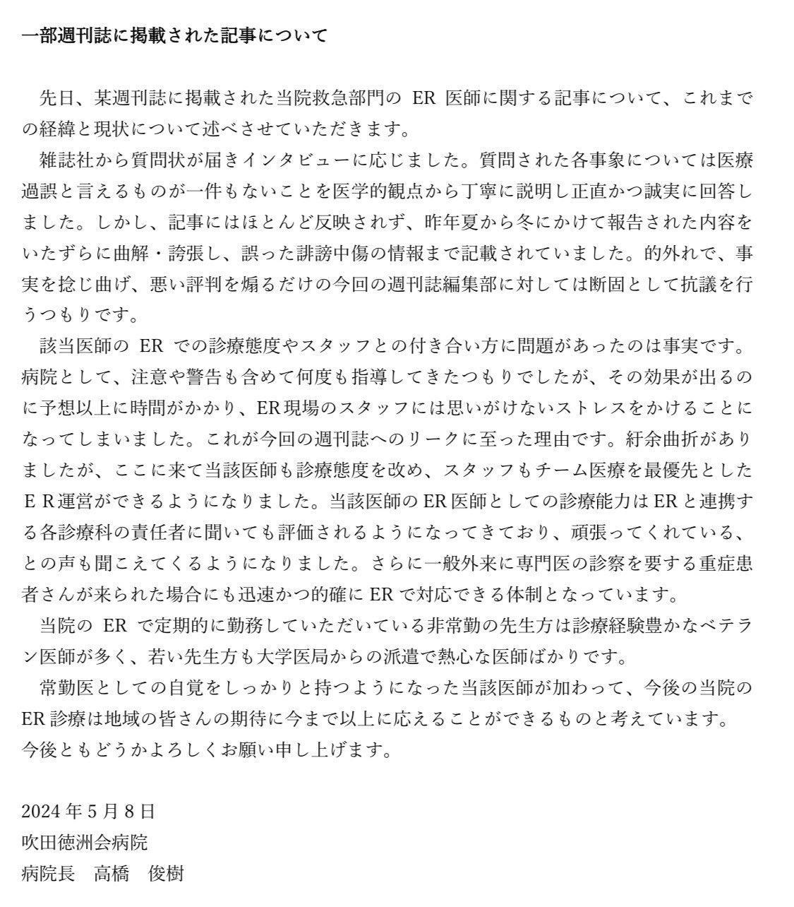 常勤医としての自覚をしっかりと持つようになった当該医師が加わって、今後の当院のER 診療は地域の皆さんの期待に今まで以上に応えることができるものと考えています。