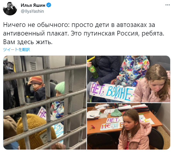ロシア野党の政治家、イリヤ・ヤシン氏が同日、SNSに投稿した写真に写っているのは、うつろな表情の3人の児童で、そのうち2人は女子。小さな手にはクレヨンとおぼしきカラフルなロシア語の文字で「нет войны(戦争はノー)」と描かれた反戦プラカードが握られ、花の絵も添えられている。3人がいるのは警察車両の護送車。頑丈な鉄格子の後ろに座らされている。3人は花を手向けるためウクライナ大使館に向かっていたところを捉えられたという。