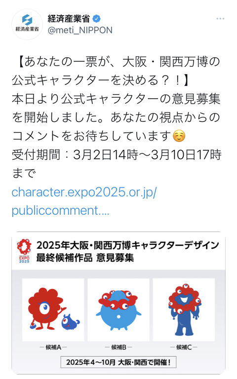 【悲報】大阪万博の公式キャラクター案、全部めちゃくちゃキモいwwww (※画像あり) Twitter Facebook はてブ LINE コピー 2022.03.03 スポンサーリンク 1:風吹けば名無し:2022/03/02(水) 16:58:57.42 ID:PaYxIkBS0.net 2:風吹けば名無し:2022/03/02(水) 16:59:07.64 ID:PaYxIkBS0.net なんでや 3:風吹けば名無し:2022/03/02(水) 16:59:21.38 ID:PaYxIkBS0.net ここはキャラクター大国日本の腕の見せ所だろ 5:風吹けば名無し:2022/03/02(水) 16:59:35.66 ID:62EKHi2Cd.net あの寄生獣みたいな奴のままでよくね? 続きを読む