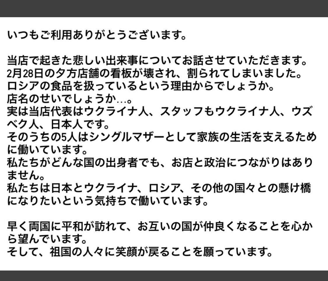 【画像】日本人「いやあぁあああああああロシア人が店開いてるうぅうううう!!!」→結果・・・ Twitter Facebook はてブ LINE コピー 2022.03.03 スポンサーリンク 1: 風吹けば名無し 2022/03/02(水) 19:59:58.39 ID:hN++MfD4r 当店をご利用のお客様へ pic.twitter.com/zWzxGFOLlu— ロシア食品専門店 “VictoriaShop” (@victoriashop_ru) March 2, 2022 続きを読む