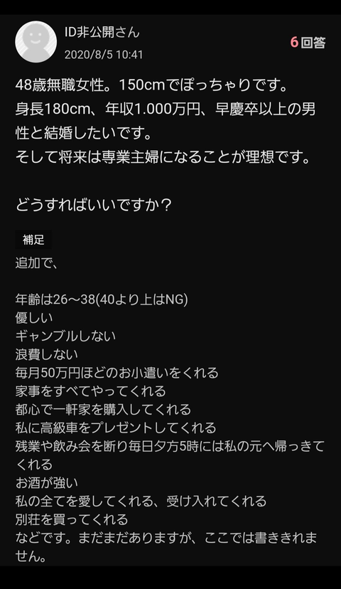 【画像】婚活女性(48歳)の男性に求める条件がこちらw w w w w w Twitter Facebook はてブ LINE コピー 2024.05.23 スポンサーリンク 1:それでも動く名無し:2024/05/22(水) 13:54:39.29 ID:4dPZLTDu0.net 3:それでも動く名無し:2024/05/22(水) 13:55:23.66 ID:+2JgDEzW0.net ネタでしょ 4:それでも動く名無し:2024/05/22(水) 13:55:46.51 ID:2dUvMAKt0.net 売れ残りなのに無駄に求め過ぎだろ 続きを読む