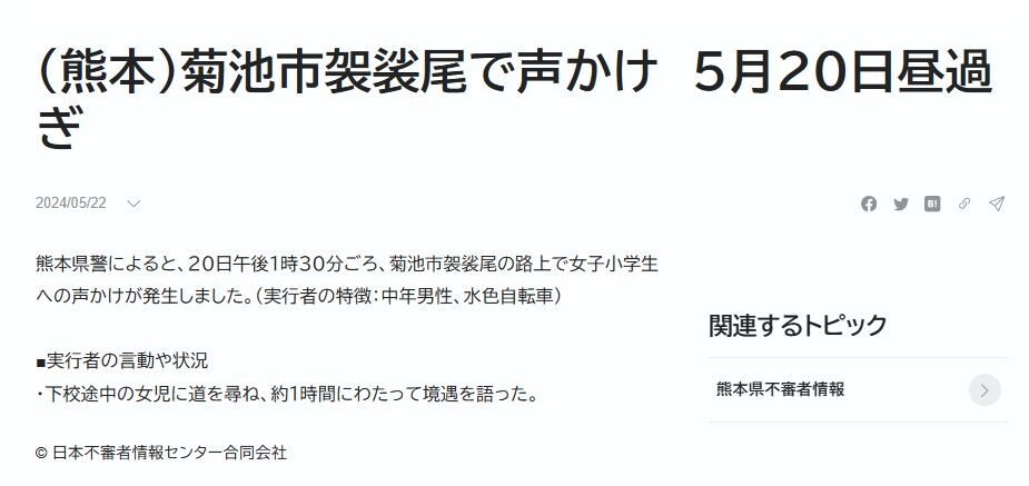 熊本県警によると、20日午後1時30分ごろ、菊池市袈裟尾の路上で女子小学生への声かけが発生しました。(実行者の特徴:中年男性、水色自転車)