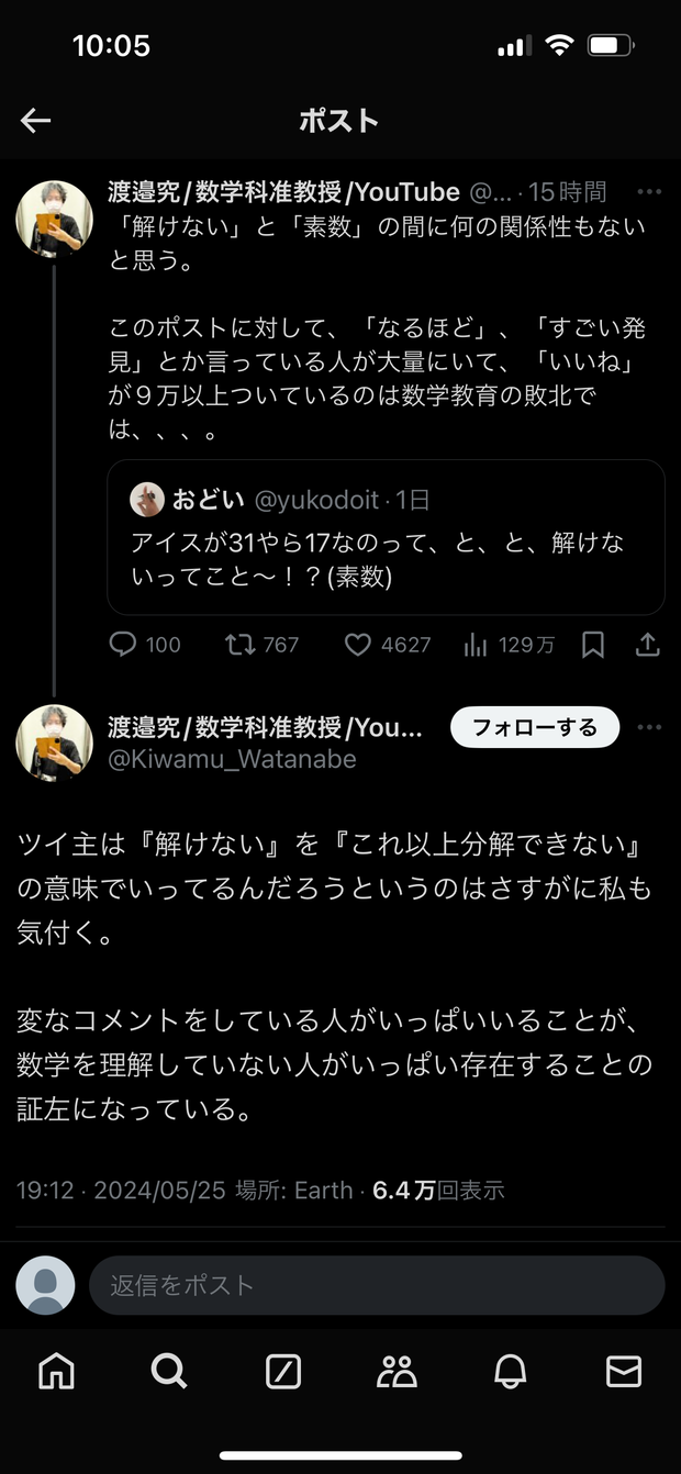 — 渡邉究/数学科准教授/YouTube (@Kiwamu_Watanabe) May 25, 2024