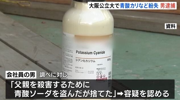 男は今年3月までこの研究室に在籍していて、調べに対し、「父親を殺害するために青酸ソーダを盗んだが捨てた」と容疑を認めています。
