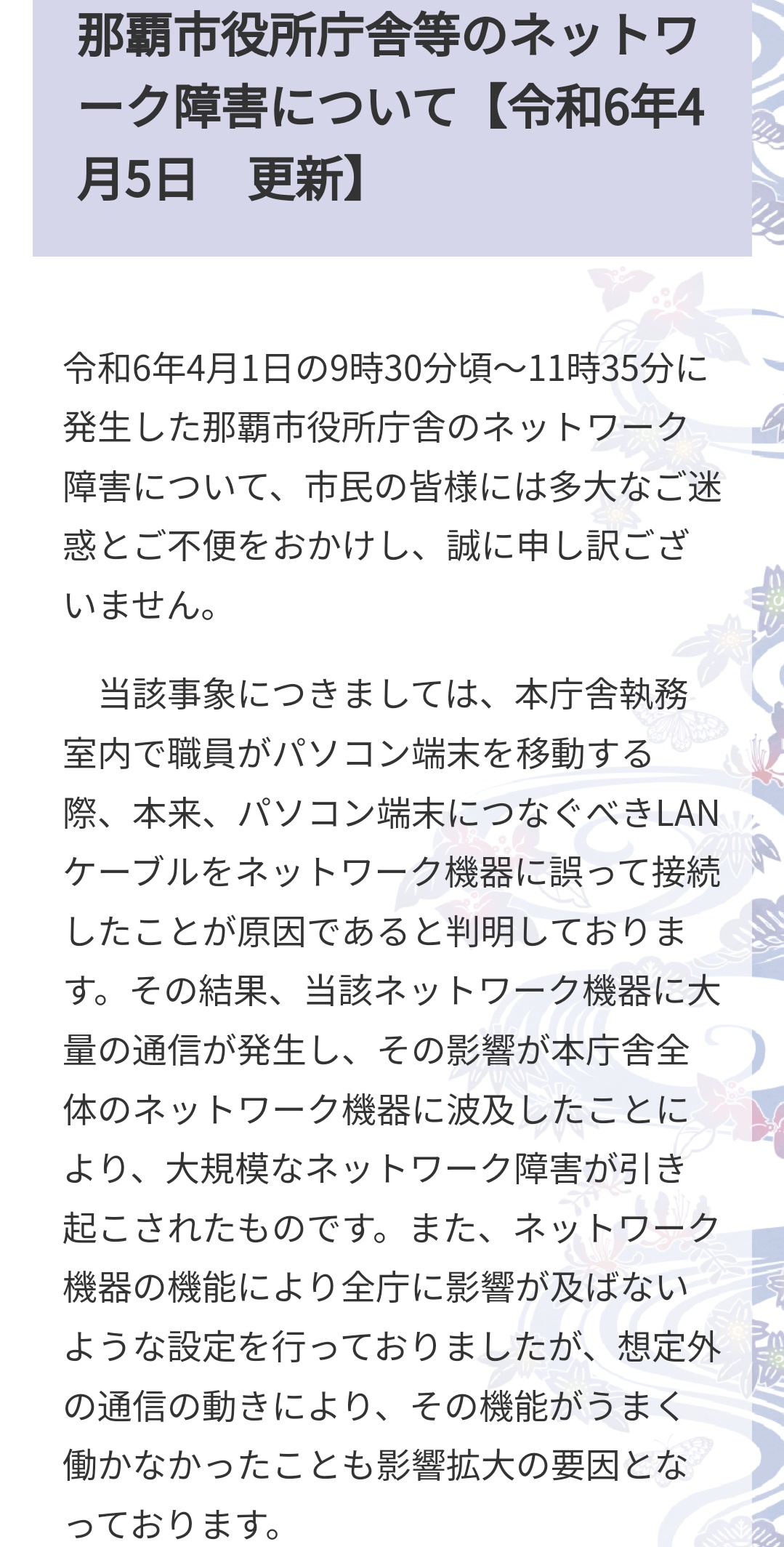 年度初めの那覇市役所を襲った全庁規模の通信まひ、原因はたった1本のLANケーブルhttps://t.co/KWXzEoOGwT