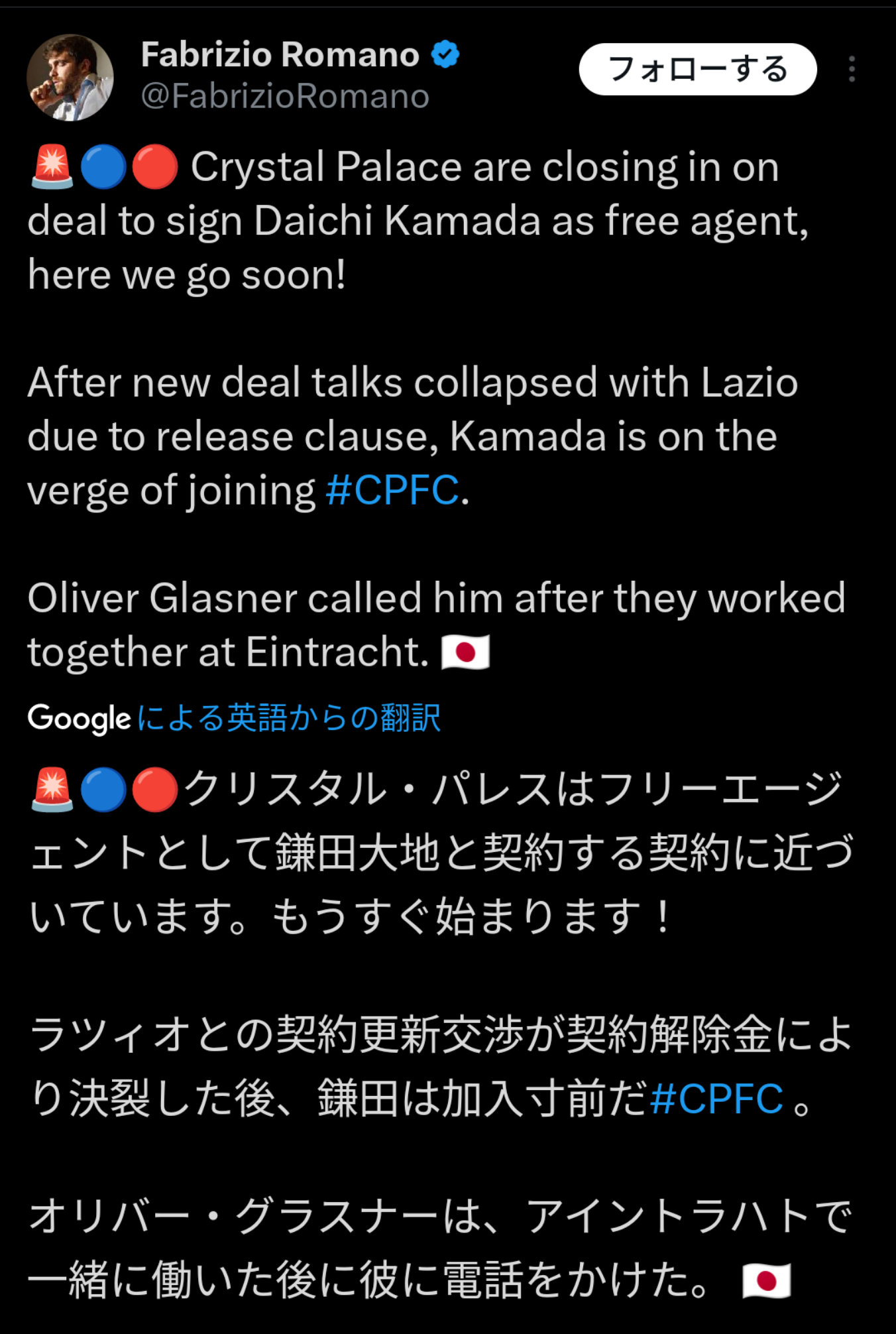 【ロマーノ砲】鎌田大地、クリスタル・パレス移籍へ Twitter Facebook はてブ LINE コピー 2024.05.31 スポンサーリンク ◇ 1: 名無しさん 2024/05/31(金) 16:48:03.759 ID:BQkCcB44B ◇ 2: 名無しさん 2024/05/31(金) 16:48:20.580 ID:BQkCcB44B 恩師グラスナーの元へ ◇ 12: 名無しさん 2024/05/31(金) 16:50:41.555 ID:hKBWEJrfM クリパ行くかも→やっぱラツィオ残る→高確率でクリパ行くかもここ数日で忙しいな 続きを読む