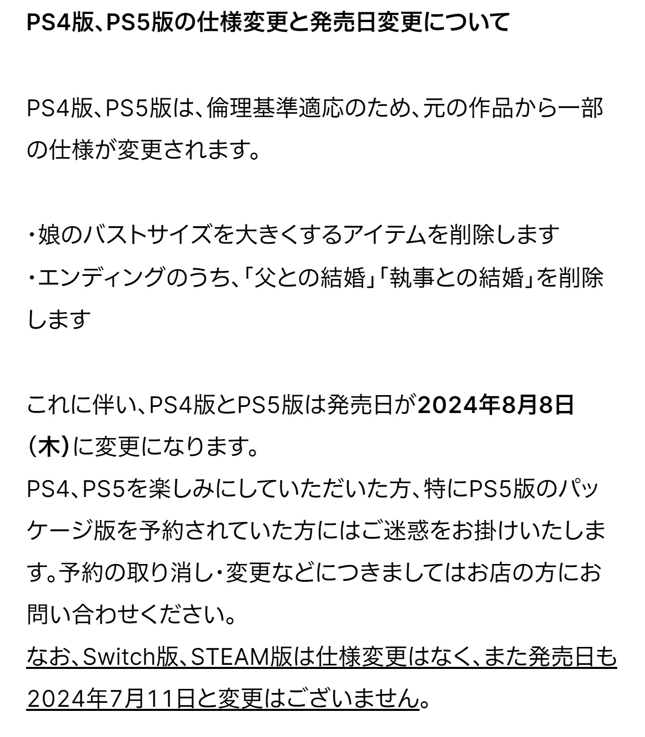 「父との結婚」「執事との結婚」エンドを削除し発売延期
