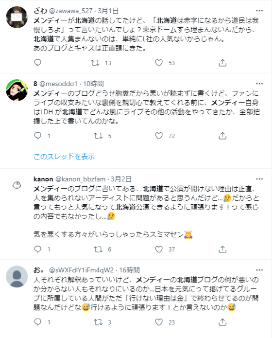「北海道ライブは採算が取りにくいから」とブログに書いてしまった模様