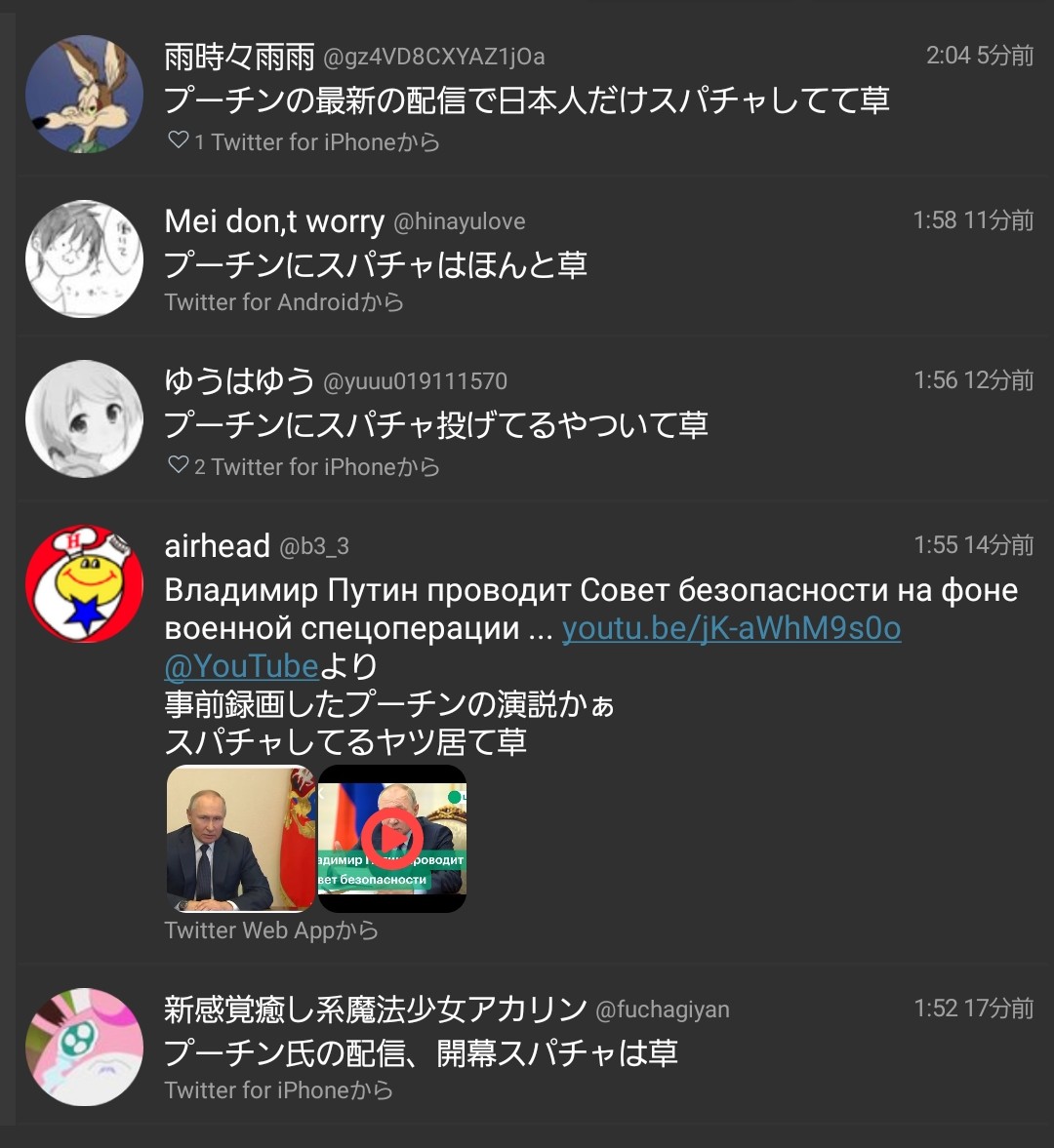 【悲報】日本人、プーチンの会見にスパチャして大爆笑する民度だったwwwwwwww Twitter Facebook はてブ LINE コピー 2022.03.04 スポンサーリンク 1:風吹けば名無し:2022/03/04(金) 05:19:03.11 ID:U/9QqYI/0.net 3:風吹けば名無し:2022/03/04(金) 05:21:07.63 ID:U/9QqYI/0.net 民度高すぎwww 4:風吹けば名無し:2022/03/04(金) 05:21:38.64 ID:U/9QqYI/0.net これが高貴なお笑いや!w 5:風吹けば名無し:2022/03/04(金) 05:23:15.66 ID:b/6gHYjY0.net ネトウヨさあ 続きを読む