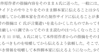 本件原作者の指摘は C 氏(編集)が言葉遣いを柔らかくしたものであっても、本件脚本家にとっては厳しい口調であってそのまま読むのはつらくなったことから本件脚本家は同年 9 月 11 日頃、A 氏(プロデューサー)に対して本件原作者からの指摘をそのまま送るのではなく、伝えるべきものを咀嚼してから伝えるよう依頼した。
