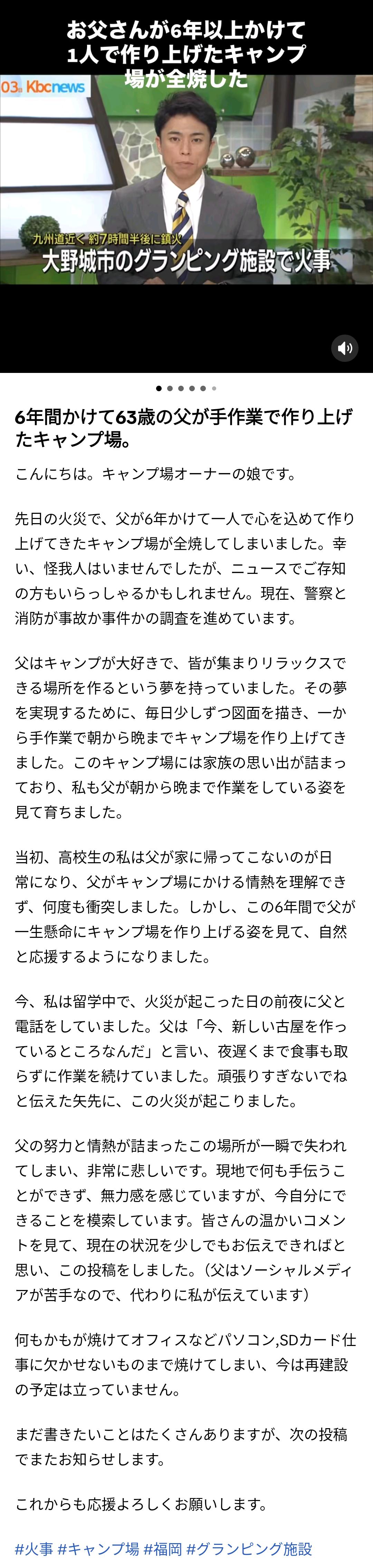 【悲報】63歳の父親が6年かけて手作業で作り上げたキャンプ場、全焼してしまう Twitter Facebook はてブ LINE コピー 2024.06.09 スポンサーリンク ◇ 1: 名無しさん 2024/06/08(土) 13:48:43.735 ID:L9RxouLqQ https://www.instagram.com/glamping_otogana/ ◇ 2: 名無しさん 2024/06/08(土) 13:48:52.522 ID:L9RxouLqQ ◇ 6: 名無しさん 2024/06/08(土) 13:50:27.192 ID:70yldruPR >>2可哀想やけど自爆やんけ 続きを読む