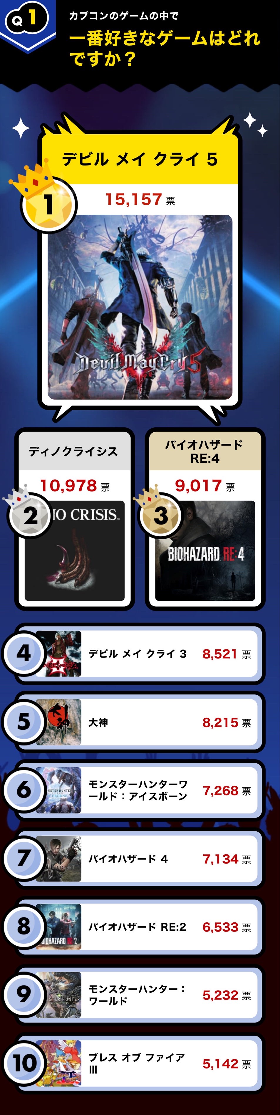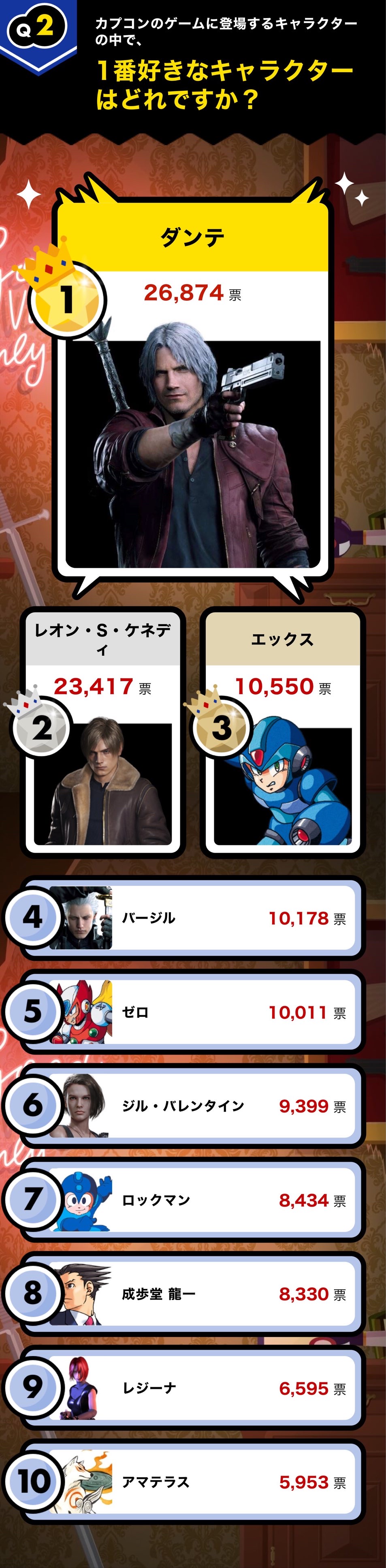 「カプコン超選挙」の結果がお披露目。「1番好きなキャラクター」ランキングは1位がダンテ、最も愛されるゲームは『デビル メイ クライ 5』に pic.twitter.com/sgpUrx75VV