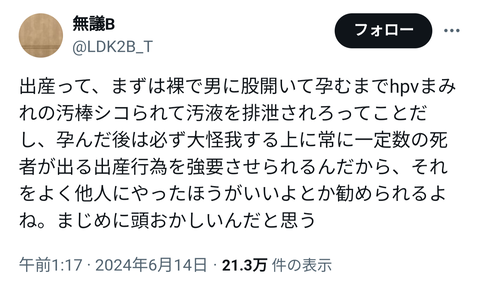 反出生フェミニストさん「出産…?それって汚棒でシ●らされて汚液を排泄されるってこと!?!?!?」 Twitter Facebook はてブ LINE コピー 2024.06.16 スポンサーリンク 1:それでも動く名無し 警備員[Lv.4][芽]:2024/06/15(土) 16:17:20.70 ID:hDZNOMWb0 2:それでも動く名無し 警備員[Lv.4][芽]:2024/06/15(土) 16:17:34.34 ID:hDZNOMWb0 ヤバすぎやろ 3:それでも動く名無し 警備員[Lv.8][新芽]:2024/06/15(土) 16:18:31.14 ID:hFjkIIWi0 この人もそうやってママから生まれてきたと言うのに 続きを読む