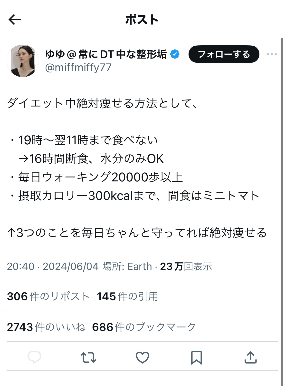 【悲報】女さん「痩せたいなら毎日20000歩以上ウォーキング、摂取カロリー300kcalまで」 Twitter Facebook はてブ LINE コピー 2024.06.18 スポンサーリンク ◇ 1: 名無しさん 2024/06/17(月) 20:09:33.168 ID:T1fOMSE9N ◇ 4: 名無しさん 2024/06/17(月) 20:10:24.478 ID:eivqH.37N 痩せるのは間違いないね😅 ◇ 5: 名無しさん 2024/06/17(月) 20:10:38.564 ID:4ECok5K0i 死にますねぇ 続きを読む