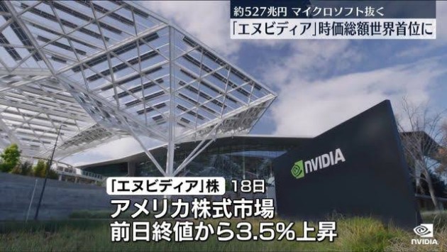 アメリカの半導体大手「エヌビディア」の時価総額が18日、マイクロソフトを抜いて世界首位となりました。