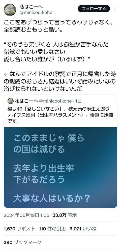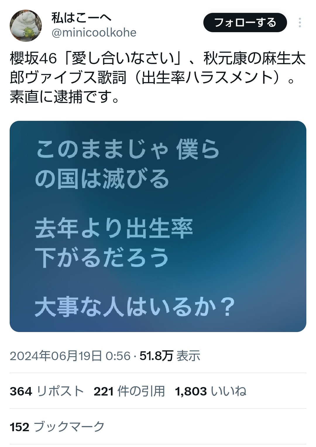 【炎上】櫻坂46「このままじゃ日本は滅びる 出生率が下がる 愛し合いなさい」 秋元康に非難轟々wwwwwwwww Twitter Facebook はてブ LINE コピー 2024.06.20 スポンサーリンク 1:(新日本) (3級) [IN]:2024/06/20(木) 16:46:38.08 BE:187477461-2BP(2000) 櫻坂46『愛し合いなさい』 https://news.yahoo.co.jp/articles/aa7e5007ea6f99afa183da69e0e9a8a0f1582cd7 VIPQ2_EXTDAT: none:none:1000:512:: EXT was configured 続きを読む