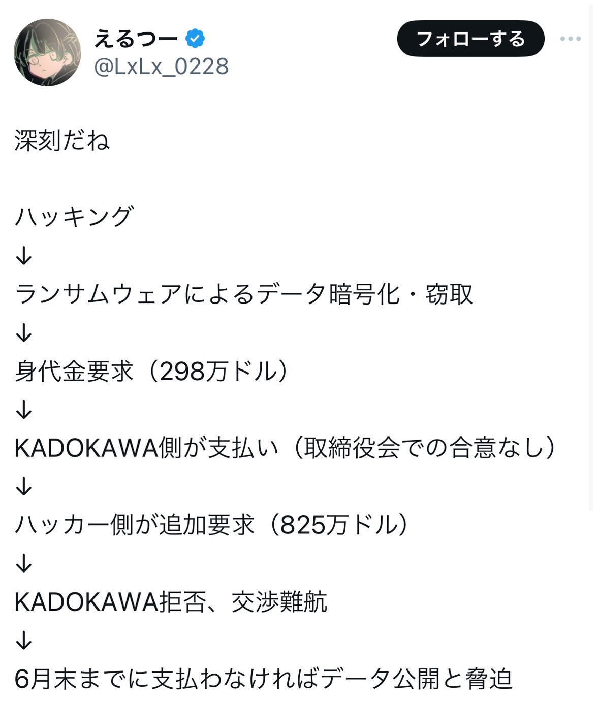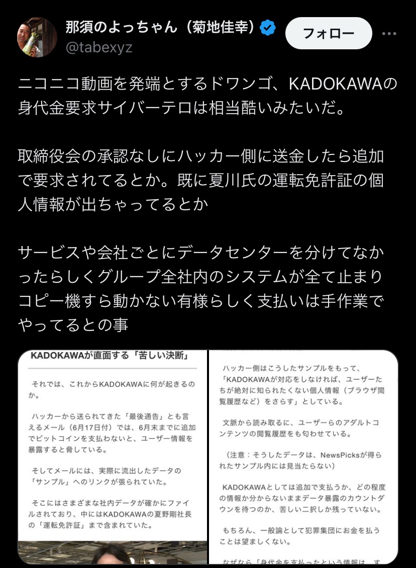 KADOKAWAが、流出データなどと引き換えに、17億円相当のビットコインを要求されている事実を突き止めた。…