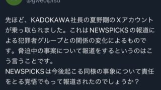 KADOKAWA社長夏野、Xアカウントを乗っ取られるwwwwwwwwwww Twitter Facebook はてブ LINE コピー 2024.06.24 スポンサーリンク 1:それでも動く名無し 警備員[Lv.12]:2024/06/24(月) 13:50:32.24 ID:oJSqRNfT0 2:それでも動く名無し 警備員[Lv.4][新芽]:2024/06/24(月) 13:51:11.52 ID:nYcX8HW0a 乗っ取られて何されたんだ? 7:それでも動く名無し 警備員[Lv.10][苗]:2024/06/24(月) 13:52:43.74 ID:EQbcHLep0 草 続きを読む