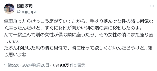 間島は「電車乗ったらけっこう席が空いてたから、手すり挟んで女性の隣に何気なく座ったんだけど、すぐに女性が向かい側の端の席に移動したのよ。んで一駅進んで別の女性が僕の隣に座ったら、その女性の隣にまた座り直したの。たぶん移動した席の隣も男性で、隣に座って欲しくないんだろうけど…感じ悪いよね」と投稿。