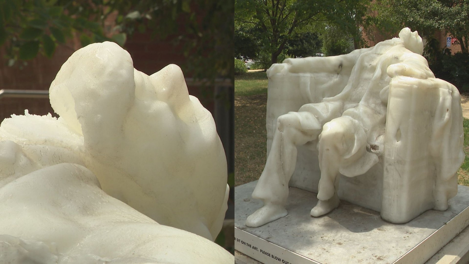 ワシントンの小学校に設置された白いかたまり。実はリンカーン元大統領の蝋人形なんですが、よくみると頭がありません。37℃を超える猛暑が連日続いたことで溶けてしまいました。